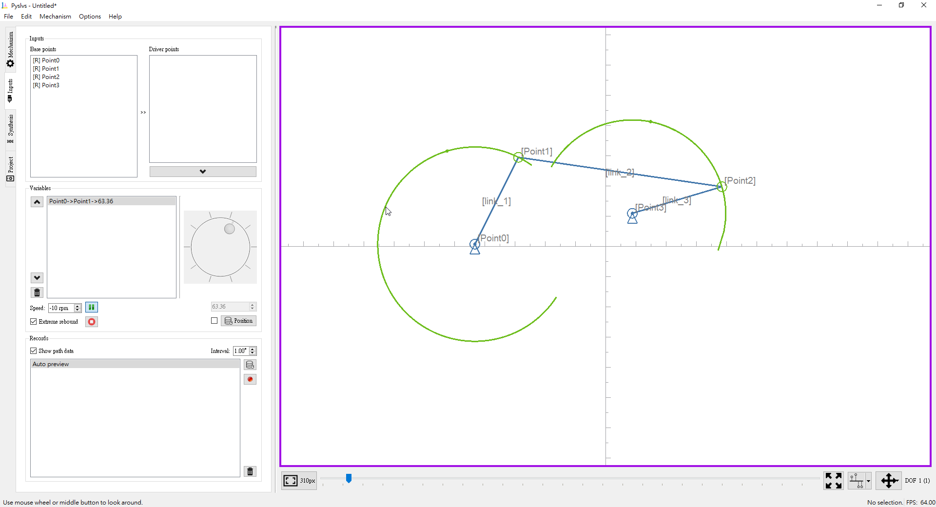 安裝並開啟pyslvs.exe,設定四連趕模擬,觀察連趕運動方向